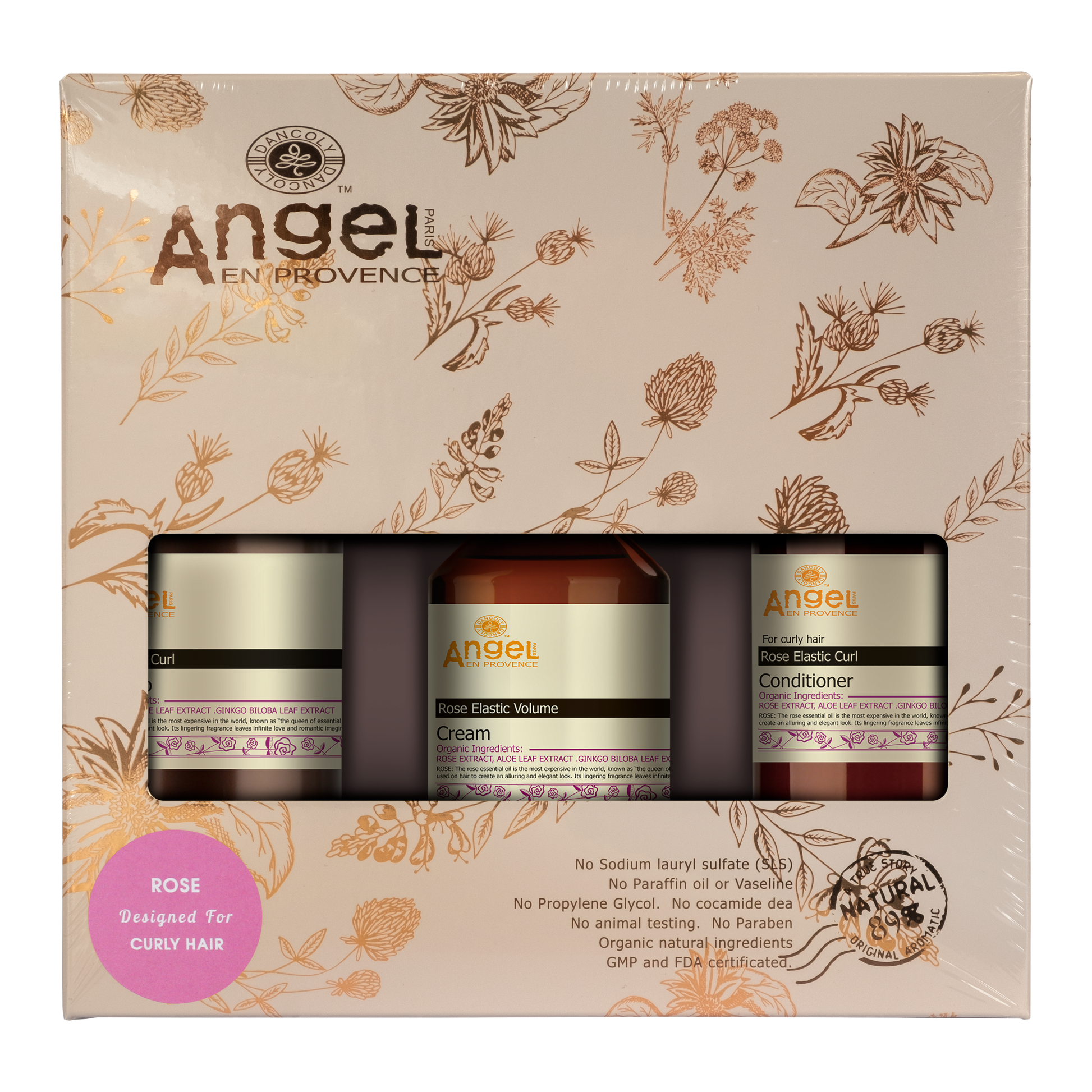 Angel en Provence Rose Elastic Volume Cream Trio Gift Pack: Consists of Rose Elastic Curl Shampoo 250ml. Rose Elastic Curl Conditioner 250ml and Rose Elastic Volume Cream 200ml. Enriched with moisturisers and repairing nutrients Effectively repairs the damaged hair after chemical treatment.
